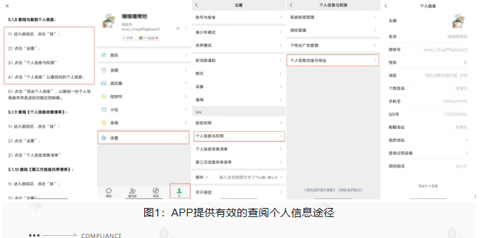 查阅隐私政策,检查APP隐私政策是否向用户说明了查阅个人信息的路径或方法,如果隐私政策提供了查阅个人信息的路径,应先按照隐私政策提供的路径尝试进行操作,检查隐私政策提供的路径是否真实有效。以下图1为提供有效查阅个人信息途径的合规示例: