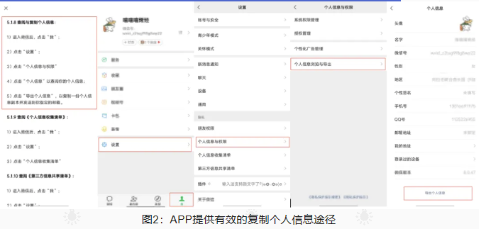 查阅隐私政策,检查APP隐私政策是否向用户说明了复制个人信息的路径或方法,如果隐私政策提供了复制个人信息的路径,应先按照隐私政策提供的路径尝试进行操作,检查隐私政策提供的路径是否真实有效。若因客观条件限制无法提供复制个人信息服务的,如基于用户业务操作的交易信息等,除数据量巨大的原因之外,还可能因竞业限制无法提供副本,对于类似情形,建议个人信息处理者在隐私政策中明示其原因。图2为提供有效复制个人信息副本的合规示例: