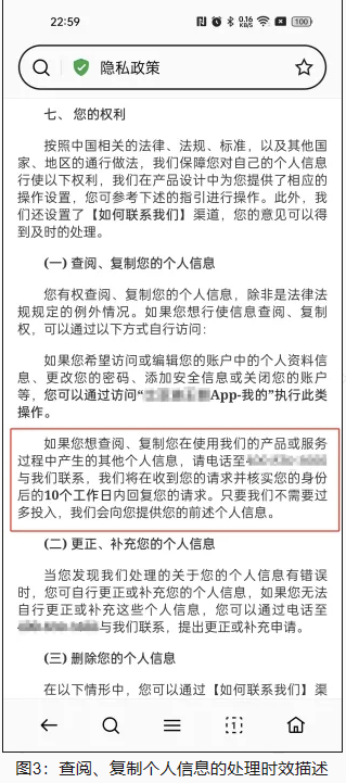 综合本章节分析,个人信息处理者应尽快处理个人查阅、复制个人信息的请求,以规避有关风险。除此之外,隐私政策中也应避免使用“会尽快处理”等此类模糊、不明确的承诺表述。以下图3为查阅、复制个人信息的处理时效描述示例: