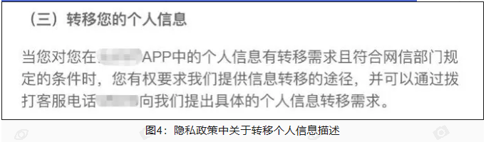 查阅隐私政策,查看隐私政策中是否说明个人信息转移请求的处理途径,若隐私政策已经明确转移途径或可处理转移请求的途径,尝试验证提供的途径是否有效;若APP未在隐私政策中说明转移个人信息的途径,但询问客服得知可提供转移服务的,建议个人信息处理者在隐私政策中补充转移个人信息的途径或方式。以下图4为个人信息处理者提供转移个人信息途径的示例: